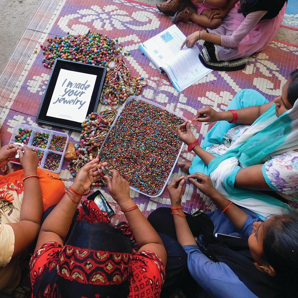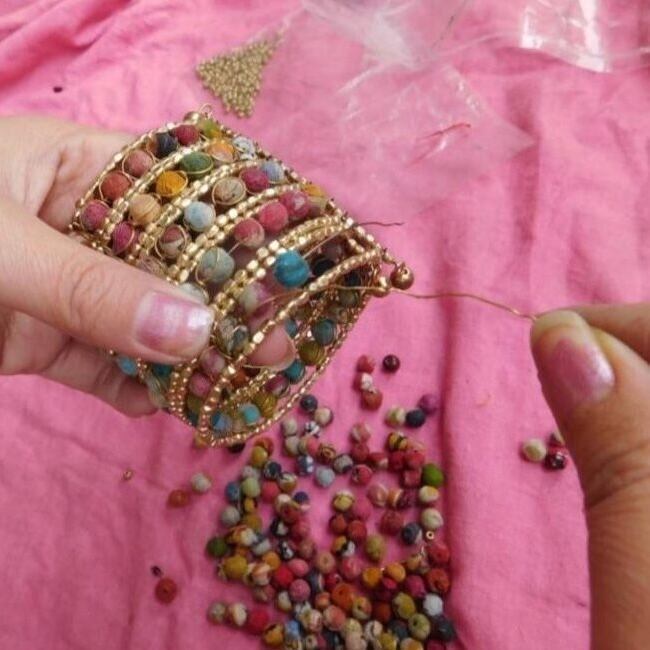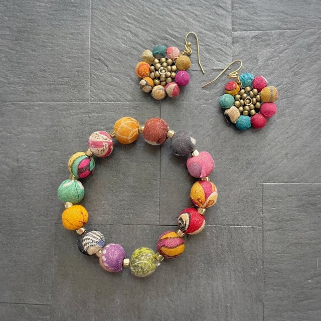 家具作りの際に出た不要な木片から小さなウッドビーズをつくり、そのひとつひとつにリサイクルサリー生地を巻きつけて作られたビーズ。それをゴールドビーズと組み合わせて繋げ合わせ、カラフルながらも上品なデザインに仕上がりました。気の遠くなるような手作業の末に出来上がったブレスレットです。