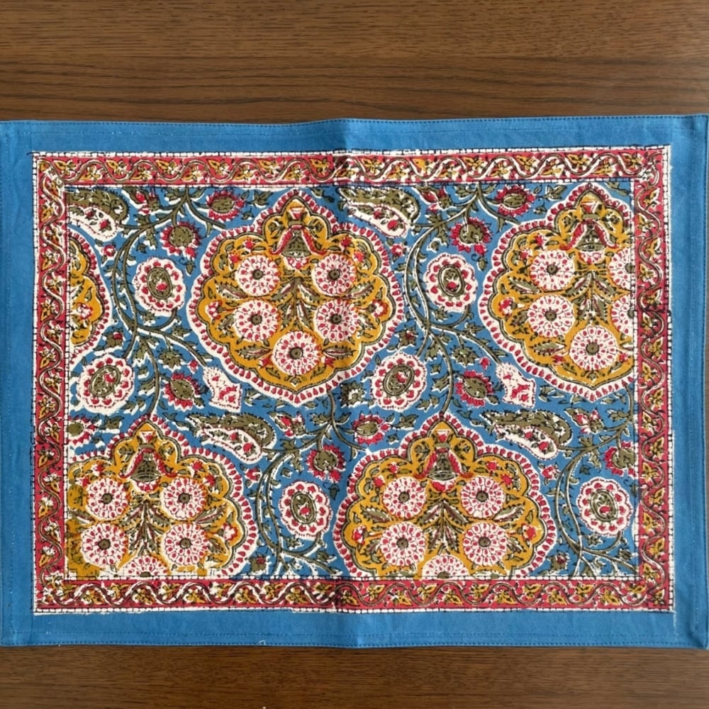 ブロックプリントの本場、インドのジャイプール地方で作られたランチョンマット。インドらしい色合いと上品な柄が、ダイニングテーブルを一瞬で華やかにしてくれます。カラフルだけれど落ち着いた色彩で高級感あるデザインに仕上がっており、いつもの食卓がパッと明るくなります。