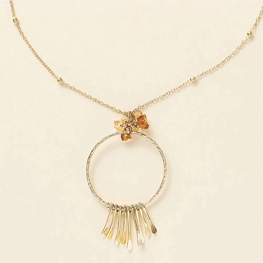シトロンとサンストーンの華やかなビーズとメタルフリンジが上品なピアス。天然石が太陽の光に照らされ、優しい光を放ちます。