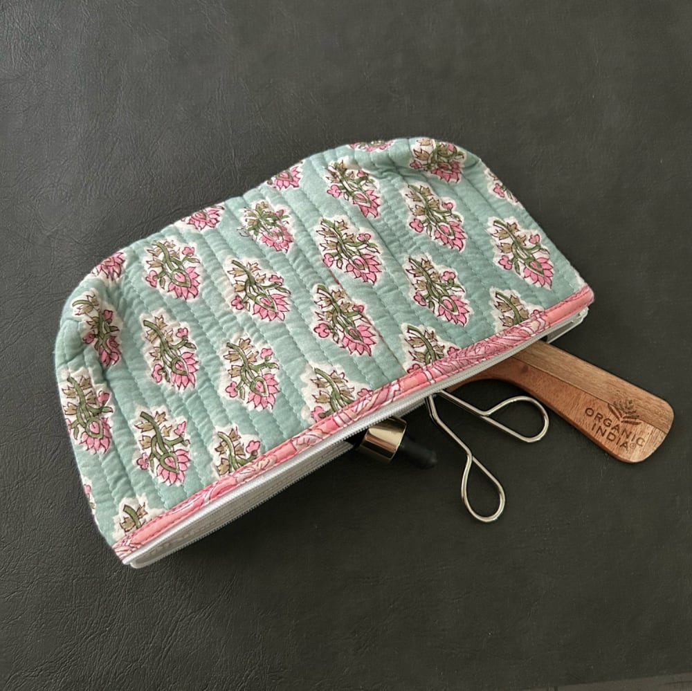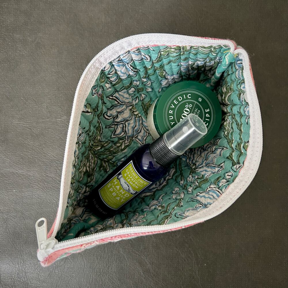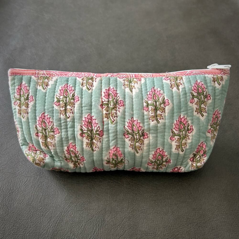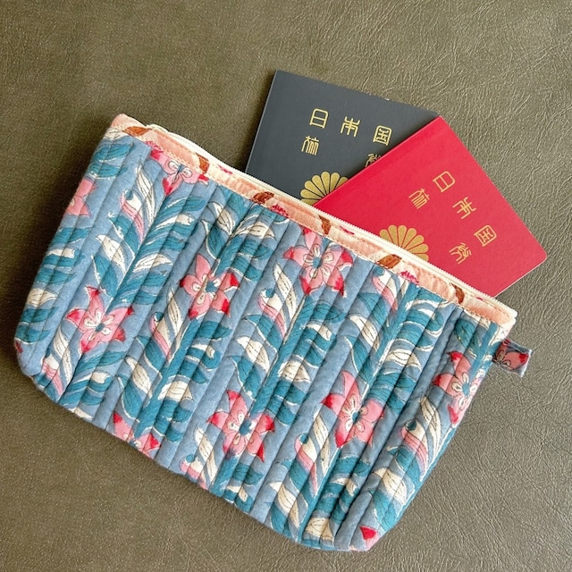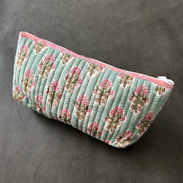可愛いフラワープリントが魅力のブロックプリントポーチ。職人による丁寧な手仕事で生み出された、やさしい色合いと柄。使う程に愛着が湧いてくる、そんなアイテムです。