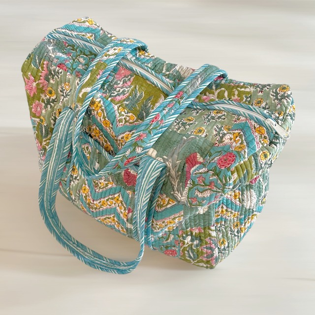 コットンキルトボストンバッグ ブロックプリント パッチワーク ブルーグリーン